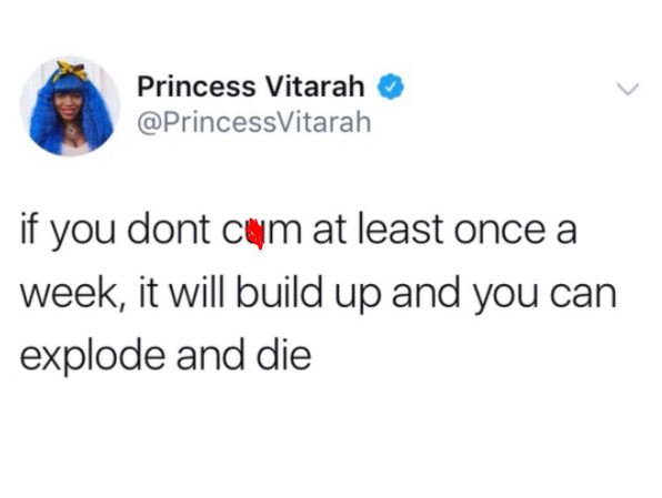 She wrote: “if you don’t cum at least once a week, you can explode and die”
