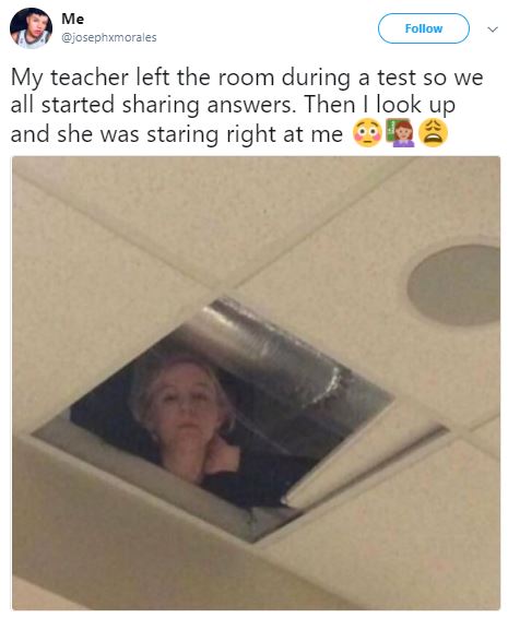Some students were left to themselves after their teacher had given them a test and left the classroom. They found her absence as a good opportunity to share answers among themselves but little did they know what their teacher was up.