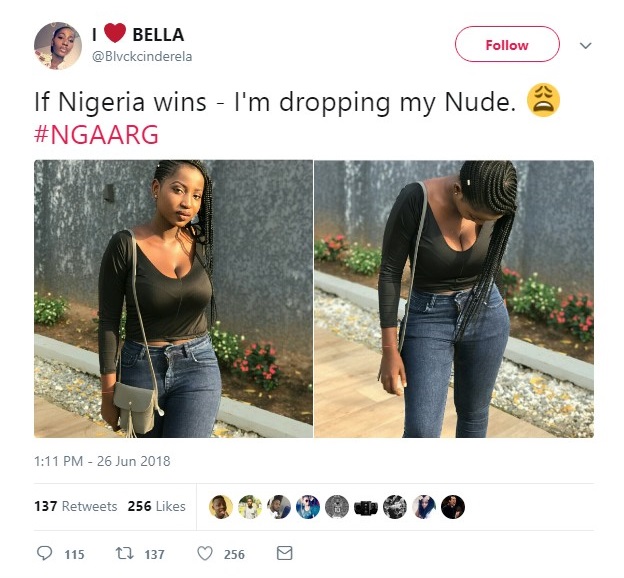 Taking to her twitter page, she wrote: “If Nigeria wins – I’m dropping my nudes”