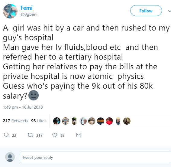 Twitter users share storiesTweets shared by various Twitter users narrate incidents where Doctors out of the goodness of their hearts treated Patients for free, only to end up with a debt that that the family members refused to pay.