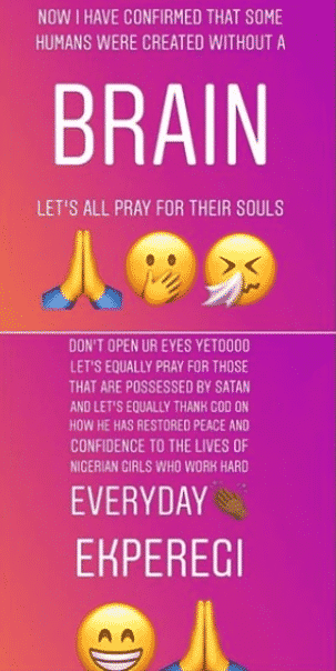 However Onye Eze’s girlfriend who reacted to claims of being set up by Okoro Blessing, stated that she has now confirmed that some people were created without brains. She also insinuated that Okoro Blessing is possessed by demons, even though God has restored confidence in the lives of Nigerians girls who work hard.