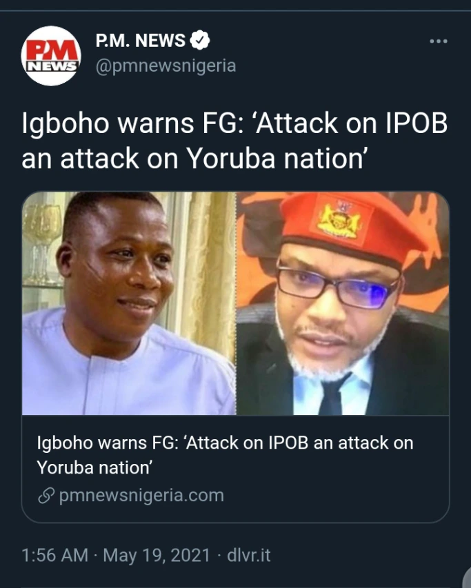 Sunday Adeyemo, also known as Sunday Igboho, a self-acclaimed Yoruba activist, has warned the Federal Government against attacking members of the Indigenous People of Biafra (IPOB), claiming that attacking the group is an attack on the Yoruba nation.
